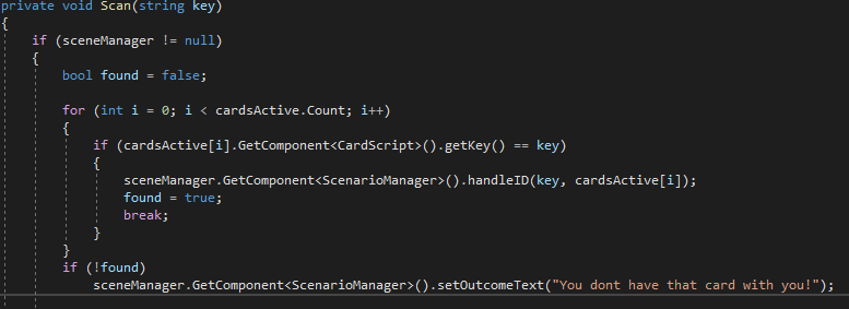 As the main programmer on the team, my role was handling the gameplay aspects, such as figuring out how to get NFC reading to work and handling the scans within scenes. Through the use of an application called “GoToTag Windows App”, which I packaged with the build of the game and automatically launched on game start, I was able to read in NFC cards and use its content as a keyboard binding(For example, ‘A’ would be written on the NFC tag, and scanning it would function as if the A key was pressed). This let the game be testable and playable on a keyboard, while at the same time being completely playable the intended way with the NFC reader and tags.